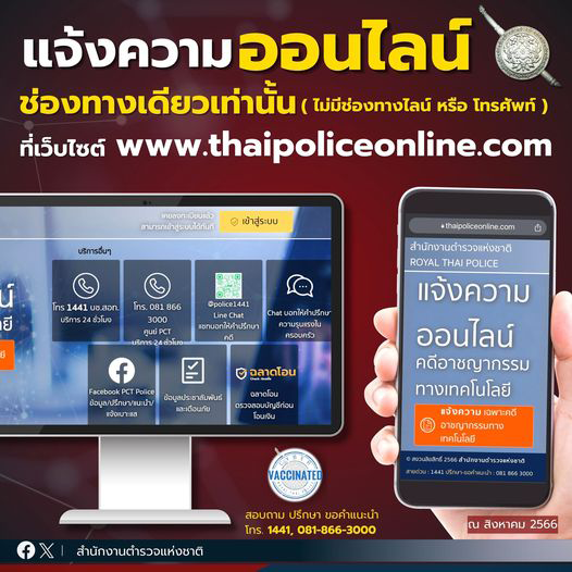 สำนักงานตำรวจแห่งชาติ และหน่วยงานในสังกัด กองบัญชาการต่าง ๆ ไม่มีช่องทางรับแจ้งความออนไลน์ในเว็บไซต์ชื่ออื่น หรือ ไลน์ ( Line ) หรือรับแจ้งความออนไลน์ทางโทรศัพท์ ( อ้างเป็นเจ้าหน้าที่ตำรวจ ) แต่อย่างใด