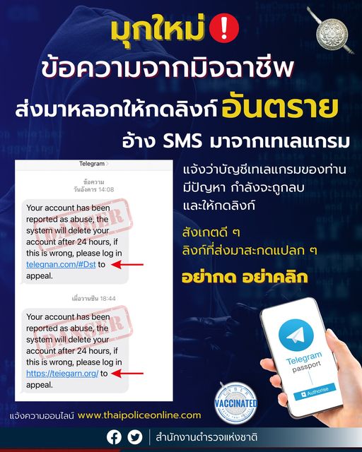 มิจฉาชีพส่งข้อความ SMS เข้ามารัว ๆ เป็นภาษาอังกฤษ อ้างว่ามาจาก Telegram ( เทเลแกรม ) แจ้งว่าบัญชีเทเ