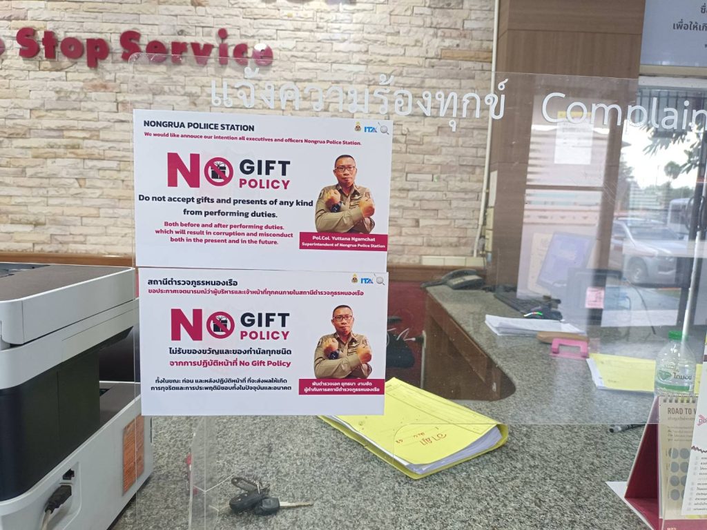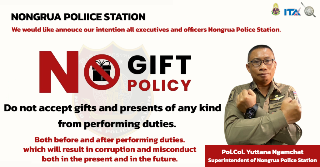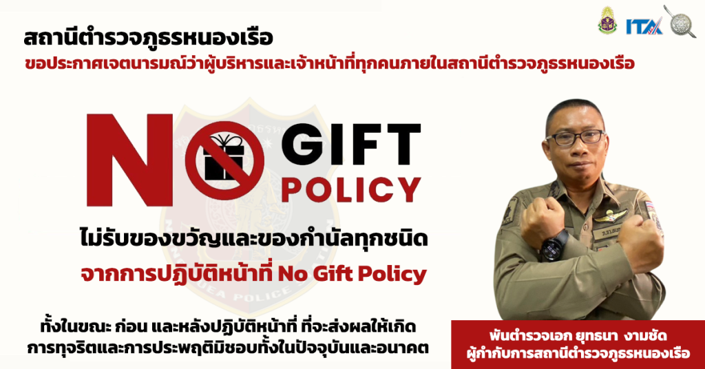 ติดไว้ในจุด บริการของสถานี เพื่อให้ประชาชนทราบว่า หน่วยงานประกาศว่าเจ้าหน้าที่ทุกคนในสังกัดไม่รับของขวัญหรือของกำนัลจากการปฏิบัติหน้าที่ และต่อต้านการรับสินบน โดยมี พ.ต.อ.ประทีป ปัญโญวัฒน์ ผกก.สภ.หนองเรือ หัวหน้าหน่วยงานประกาศ